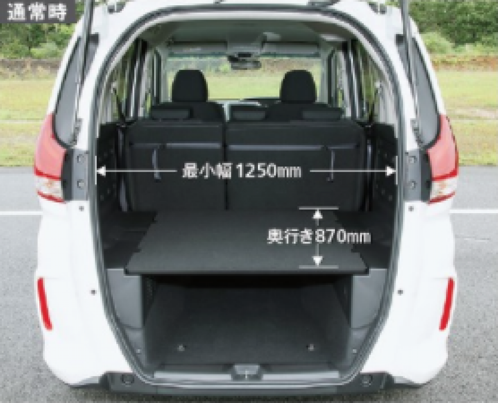 次は、具体的にラゲッジルームを検証してみよう。フリードプラスは、5名乗車の場合で、最小幅1250mm、室内高(モール部分)1280mm、奥行き870mm、2名乗車なら奥行きは1640mmまで広がる。対するN-VANは、最小幅905mm、室内高(モール部分)1295mm、奥行きが760mm。2名乗車の場合の奥行きは1550mmである。