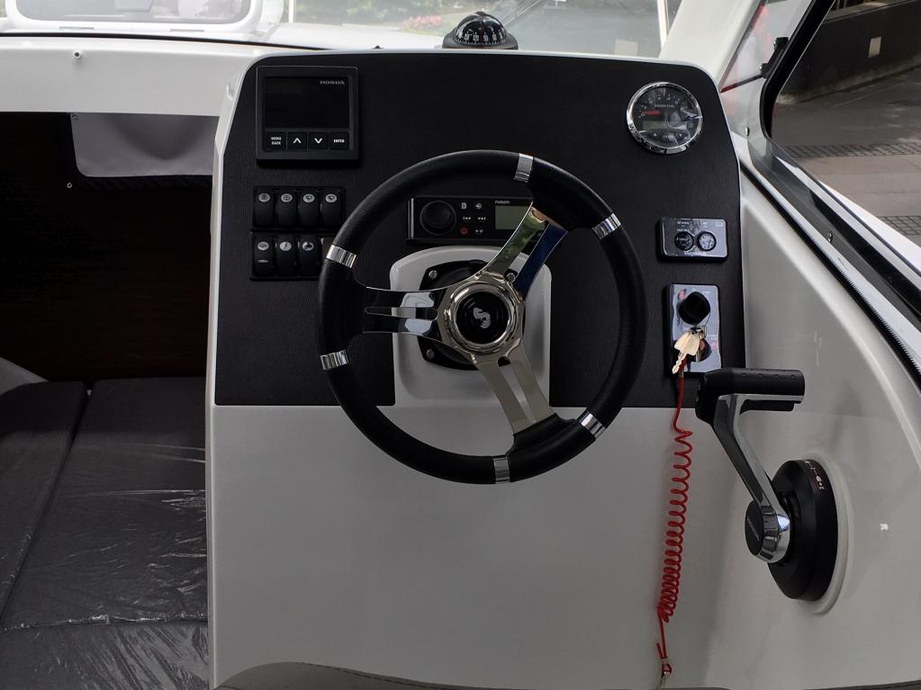 エンジンはV型6気筒3.6Lで、なんとVTEC(可変バルブリフト&タイミング)を搭載! 最高出力250psを発生する。推奨回転範囲は5300〜6300rpmと、船外機の知識のない者にとっては意外と高回転型のように感じられる。操縦はDBW(ドライブ・バイ・ワイヤ)によって行われる。