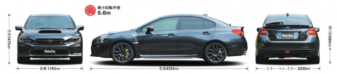 スバル WRX STIのサイズは全長4,595×全幅1,795×全高1,475mmで最低地上高140mm。車種はコンパクトなハッチバックだが現在のスバル インプレッサよりほんの少しだけ大きい。そのぶん、最小回転半径はインプレッサの5.3mよりも若干大きい5.6mになっている。実はホイールベースもインプレッサに比べて20mmほど長いのだ。