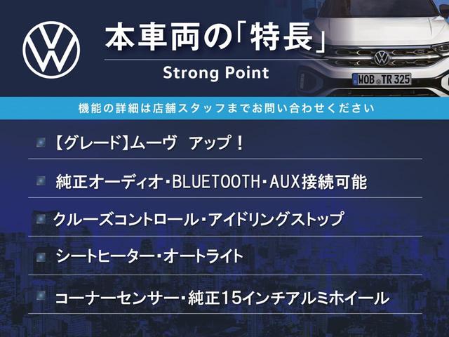フォルクスワーゲン アップ!ムーブ アップ! 純正オーディオ Bluetooth AUX シートヒーター クルーズコントロール コーナーセンサー オートライト アイドリングストップ 純正15インチアルミホイール ETC 禁煙車
