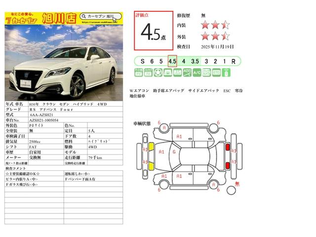 トヨタ クラウンハイブリッドRSアドバンス Four 4WD サンルーフ シートヒータ Bluetooth接続 バックモニター 衝突軽減 パークアシスト 横滑防止装置 寒冷地仕様 フルセグテレビ LEDライト コーナーセンサー ドライブレコーダー
