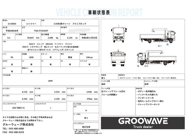 日野 ヒノレンジャー2.9t吊4段クレーン アルミブロック 古河ユニック URU344 フックイン ラジコン 造りボデー 5,410×2,150 車検付 走行59千km 積載2t F6 6速 マニュアル UNIC 吊t数2.9t吊 4段ブーム アルミアオリ