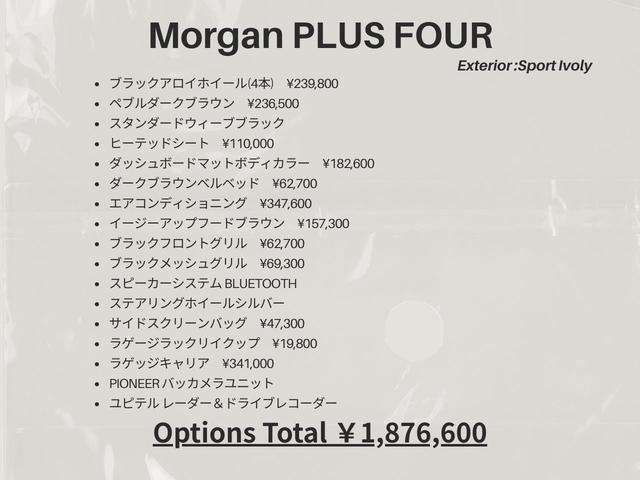 モーガン プラス4ベースグレード OP187/6MT/ワンライト/ワンテール/エアコン/ラゲッジキャリア/シートヒーター/ブラックアロイ/ブラックグリル/イージーアップフードブラウン/ダッシュボードマットボディカラー/ワンオナ