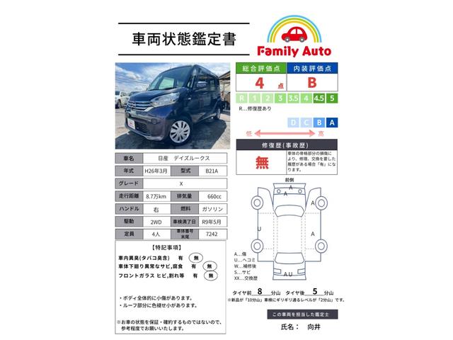 日産 デイズルークスX 鑑定書付 純正ナビ フルセグ CD 両側パワースライドドア アラウンドビューモニター アイドリングストップ タッチパネル式エアコン スマートキー フルフラット 禁煙車