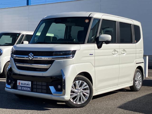 スズキ スペーシアカスタムハイブリッドXSターボ 届出済未使用車 両側電動スライドドア 衝突軽減装置 レーダークルーズ シートヒーター レーンアシスト コーナーセンサー スマートキー LEDヘッド オートハイビーム ハーフレザーシート