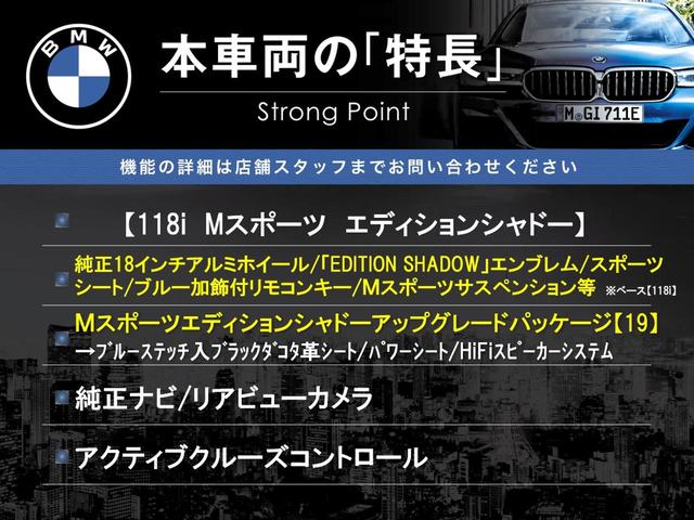 BMW 1シリーズ118i Mスポーツ エディションシャドー MスポーツエディションシャドーアップグレードPKG 黒革シート パワーシート 純正ナビ リアビューカメラ アクティブクルーズコントロール ドライビングアシスト 純正18インチアルミホイール ETC