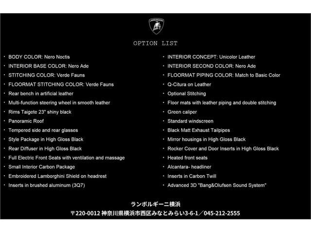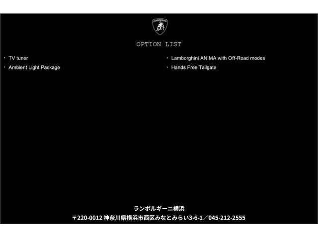 | 保証コメント | 保証付:販売店保証 保証期限:2027年1月 保証距離:100,000km 【Lamborghini新車保証継承】期間:初回車検時まで有効 距離:100,000Km以内 |