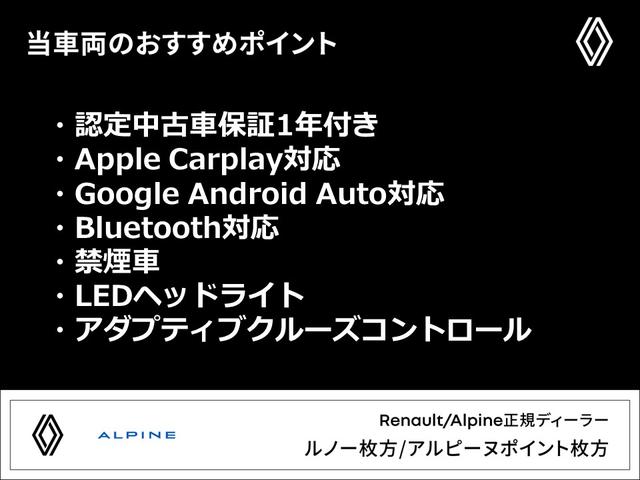 | 保証コメント | 【一年間の走行距離無制限保証】エンジンやブレーキ等の主要部品最大93項目を点検整備。車両登録後一年間走行距離に問わず保証。※消耗品等一部対象外があります。詳細はルノー枚方スタッフまで♪ |