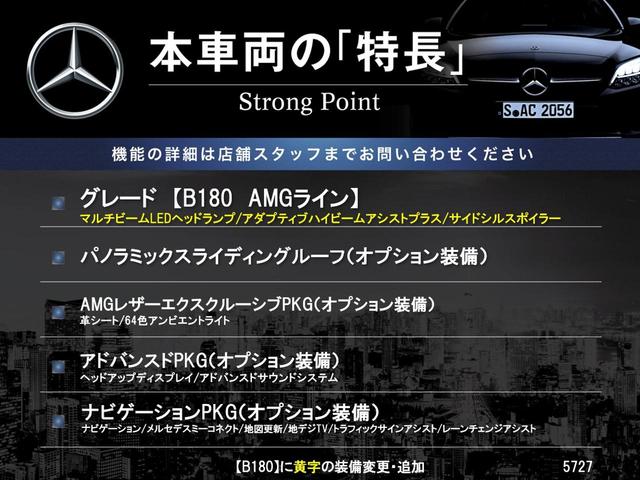 B180 AMGレザーエクスクルーシブパッケージ AMGレザーエクスクルーシブパッケージ/アドバンスドパッケージ/360°カメラシステム/パノラミックスライディグルーフ/ヘッドアップディスプレイ/LEDヘッドライト/18インチAMGアルミホイール