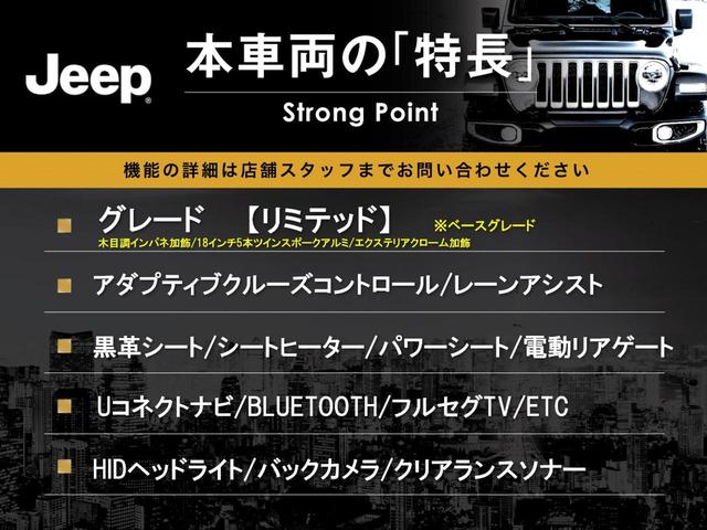 クライスラー・ジープ ジープ・グランドチェロキーリミテッド アダプティブクルーズコントロール 黒革シート パワーシート シートヒーター 電動リアゲート バックカメラ クリアランスソナー HIDヘッドライト Uコネクト純正ナビ フルセグTV Bluetooth